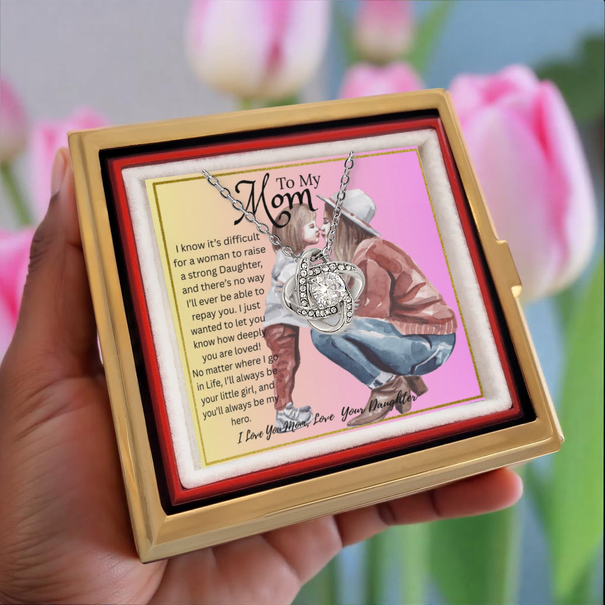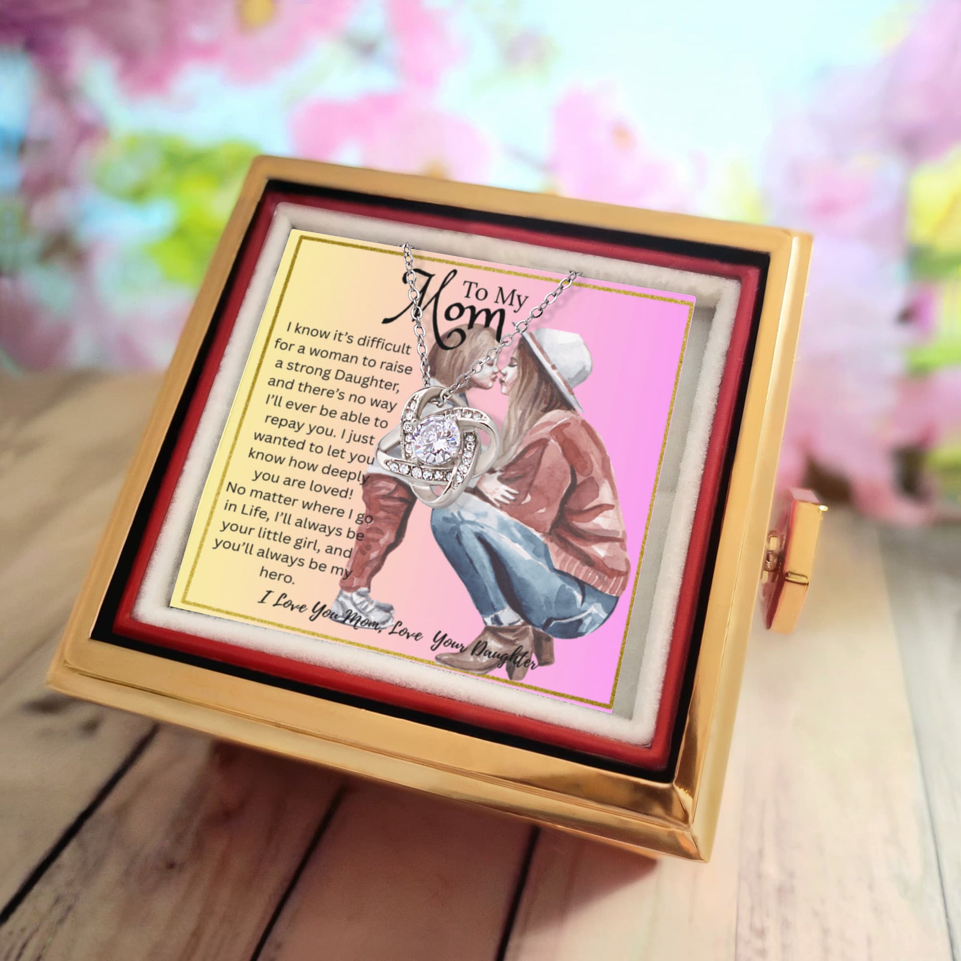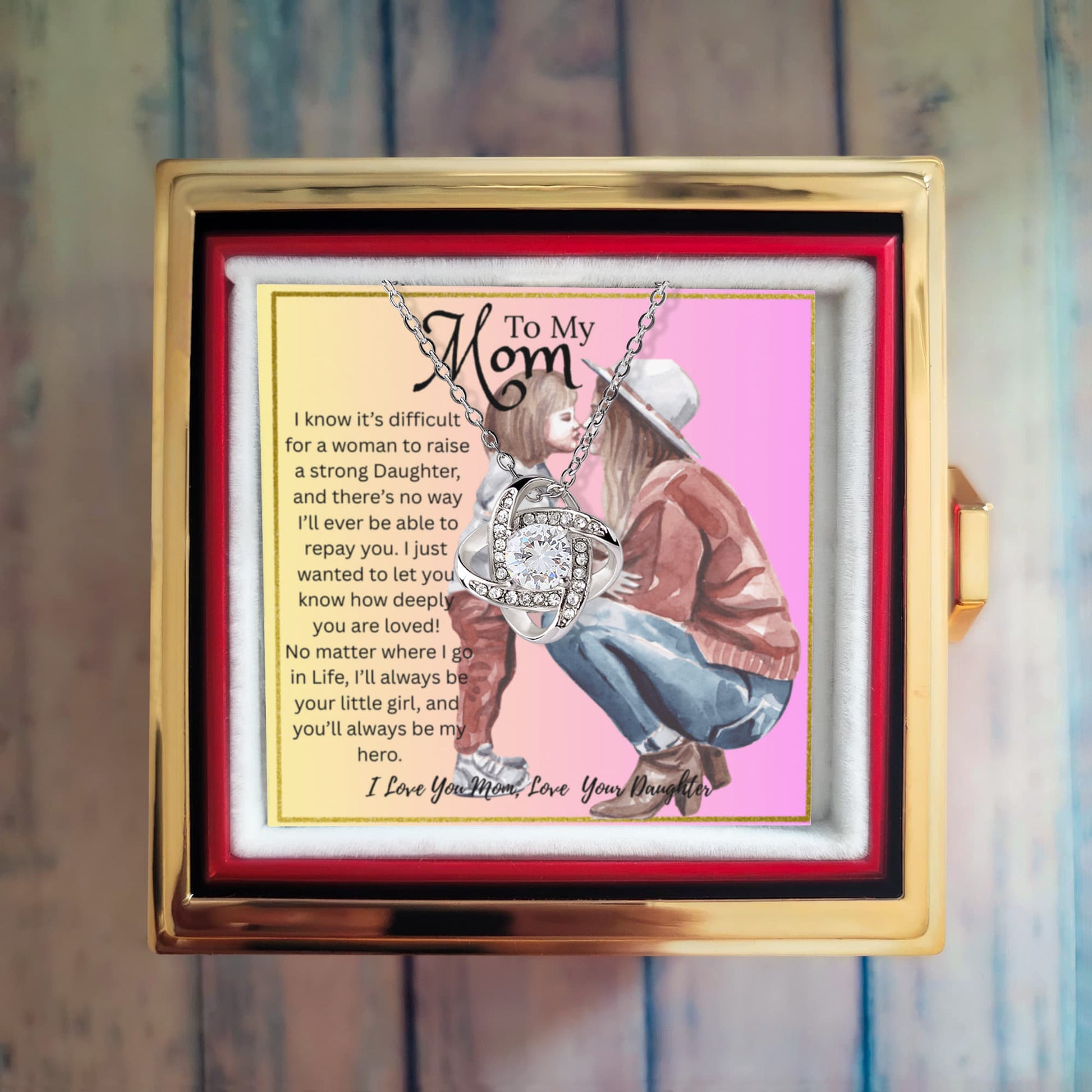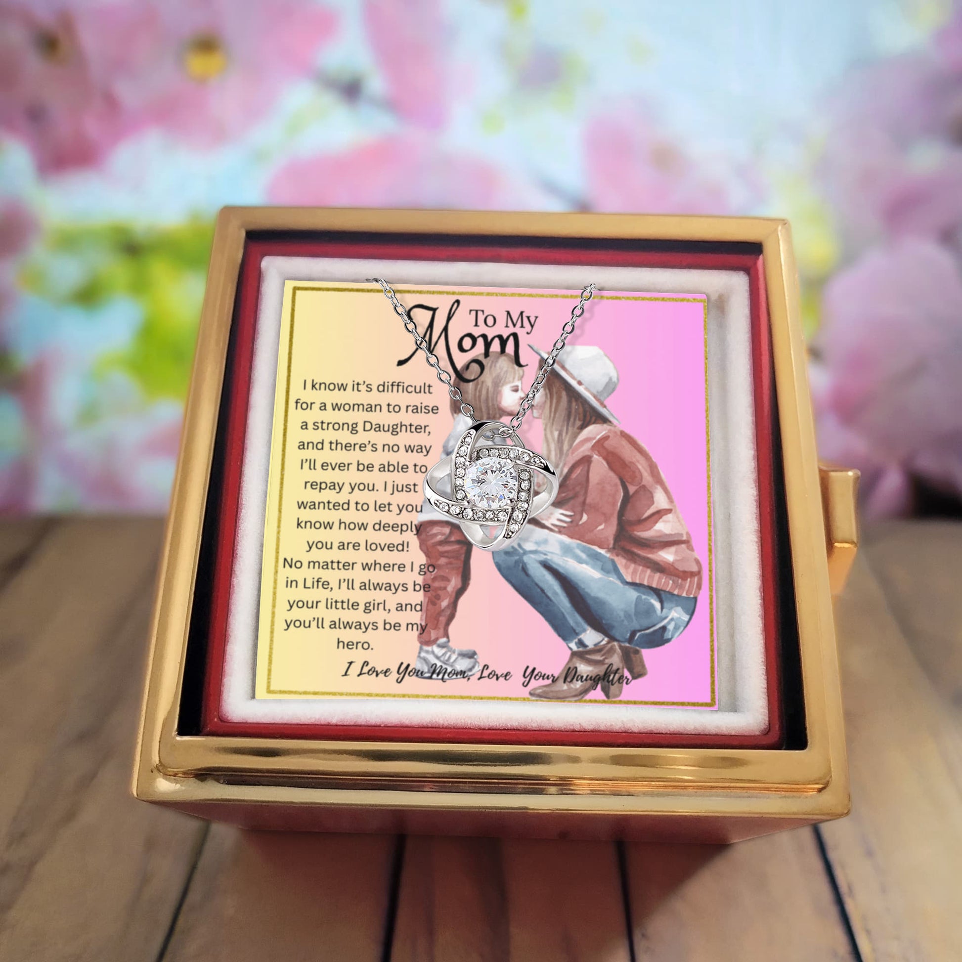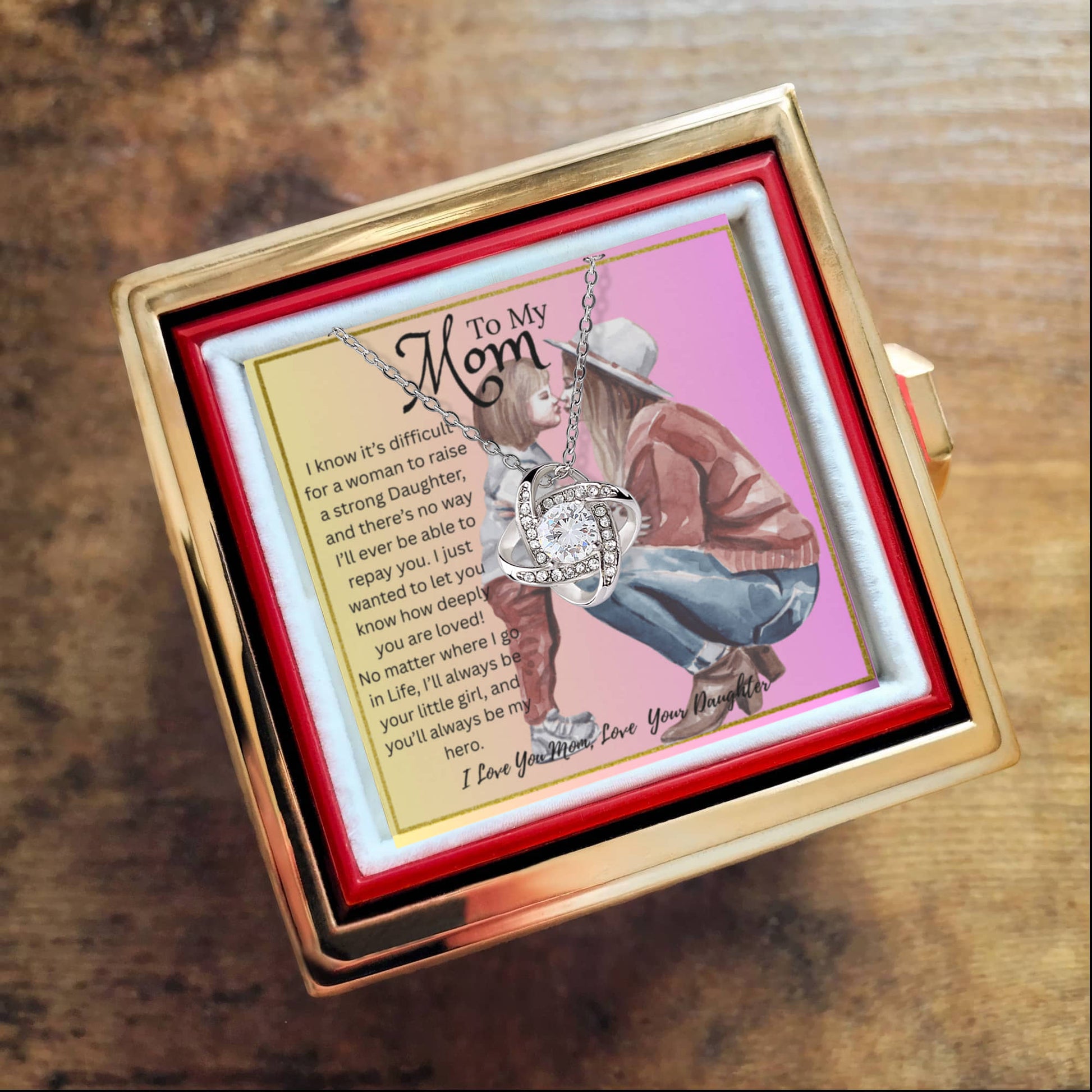 Imagine her reaction as she receives this beautiful Love Knot Necklace. Representing an unbreakable bond between mother and daughter, this stunning pendant is adorned with premium cubic zirconia crystals, making it a timeless symbol of love and devotion. The luxurious box, featuring a meticulously preserved rose that never fades, adds an extra touch of love. With a simple turn of the gold knob, her breathtaking gift is revealed—making it the perfect sentimental gift for that special someone.