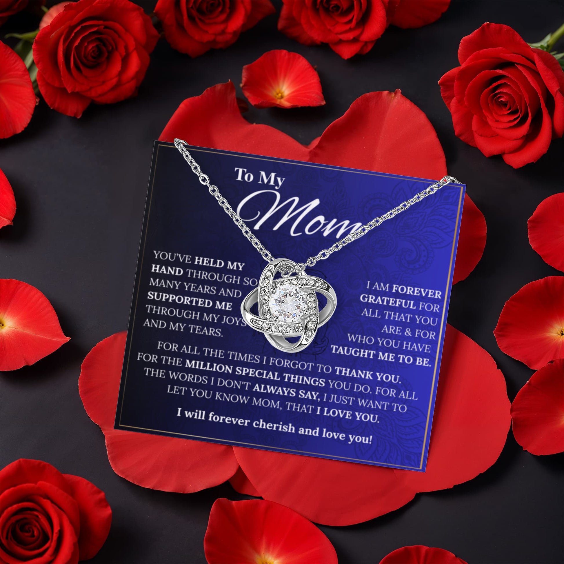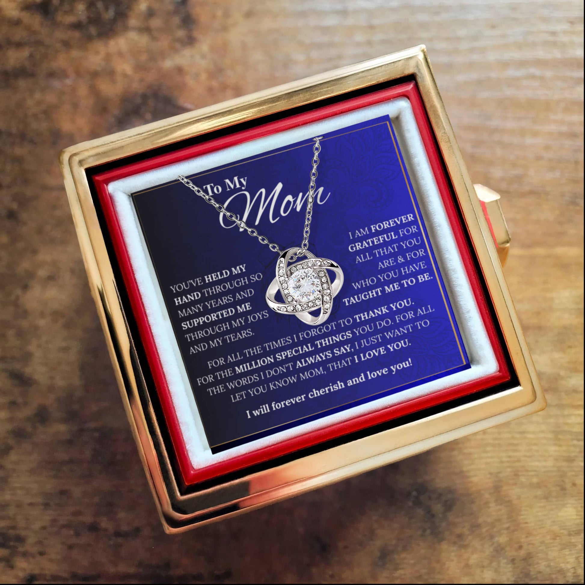Imagine her reaction as she receives this beautiful Love Knot Necklace. Representing an unbreakable bond between mother and son, this stunning pendant is adorned with premium cubic zirconia crystals, making it a timeless symbol of love and devotion. The luxurious box, featuring a meticulously preserved rose that never fades, adds an extra touch of love. With a simple turn of the gold knob, her breathtaking gift is revealed—making it the perfect sentimental gift for that special someone.